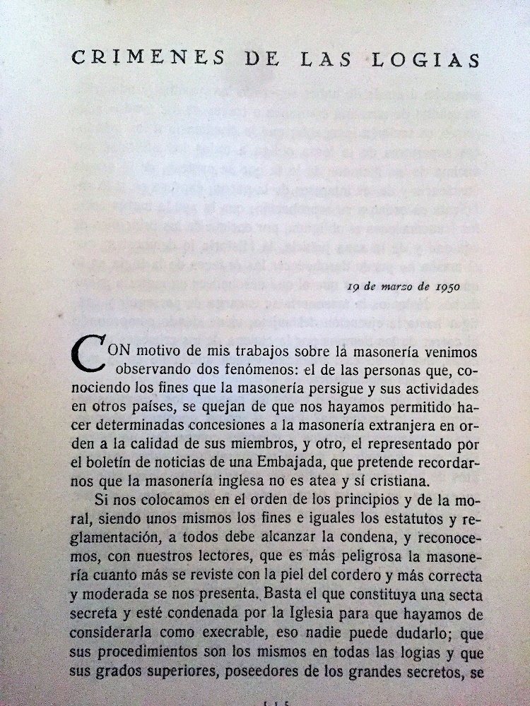 Página del libro con un artículo sobre los supuestos crímenes de las logias.
